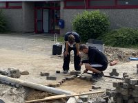 Nun kommen wir noch zur letzten Baugruppe, Baugruppe 4, bestehend aus Jasmina, Linn, Robin, Sidney, Simon, Yasmin, Fynn und ihrem Teamleiter Ted. Da die Gruppen, wie oben schon erklärt, heute aufgeteilt wurden, beschäftige sich die eine Hälfte der Baugruppe, unter Anleitung von Jakob, mit dem Pflastern des Grabens. Diesen baggerte Andreas die Tage zuvor auf, um die LAN-Kabel quer über den Hof zur Sporthalle zu verlegen. Währenddessen errichteten die anderen eine Fallschutzwand oder flexten überstehende Gewindestangen ab. Da jeder genau wusste, worin heute die eigene Aufgabe bestand, konnten alle tatkräftig zupacken. So ging die Arbeit schnell voran, sodass nach dem wohlverdienten Mittagessen nur noch Kleinigkeiten anfielen, die als Feinschliff gewertet werden können. Anschließend begann das gemeinschaftliche Aufräumen der Großbaustelle.