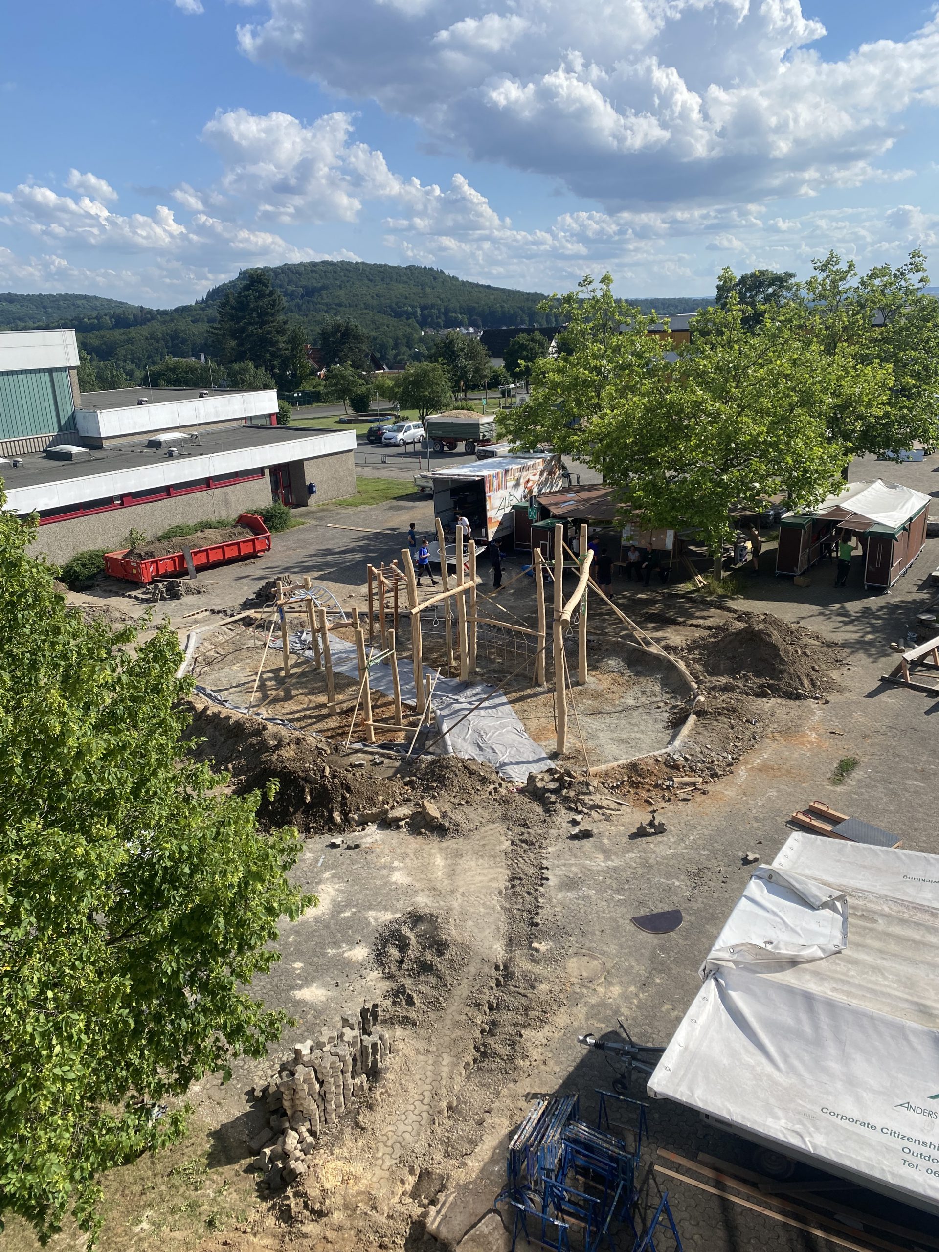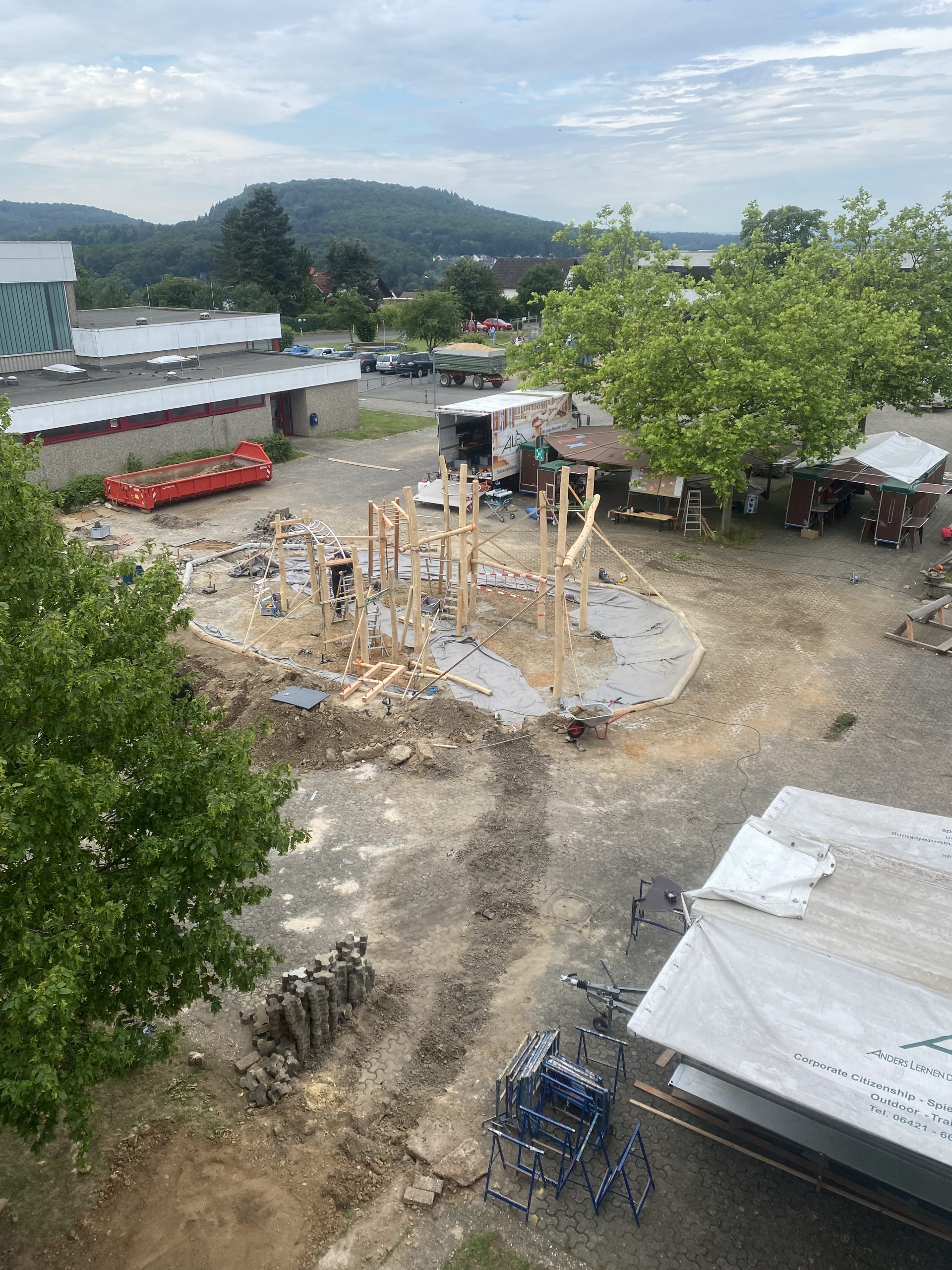 Nun kommen wir noch zur letzten Baugruppe, Baugruppe 4, bestehend aus Jasmina, Linn, Robin, Sidney, Simon, Yasmin, Fynn und ihrem Teamleiter Ted. Da die Gruppen, wie oben schon erklärt, heute aufgeteilt wurden, beschäftige sich die eine Hälfte der Baugruppe, unter Anleitung von Jakob, mit dem Pflastern des Grabens. Diesen baggerte Andreas die Tage zuvor auf, um die LAN-Kabel quer über den Hof zur Sporthalle zu verlegen. Währenddessen errichteten die anderen eine Fallschutzwand oder flexten überstehende Gewindestangen ab. Da jeder genau wusste, worin heute die eigene Aufgabe bestand, konnten alle tatkräftig zupacken. So ging die Arbeit schnell voran, sodass nach dem wohlverdienten Mittagessen nur noch Kleinigkeiten anfielen, die als Feinschliff gewertet werden können. Anschließend begann das gemeinschaftliche Aufräumen der Großbaustelle.
