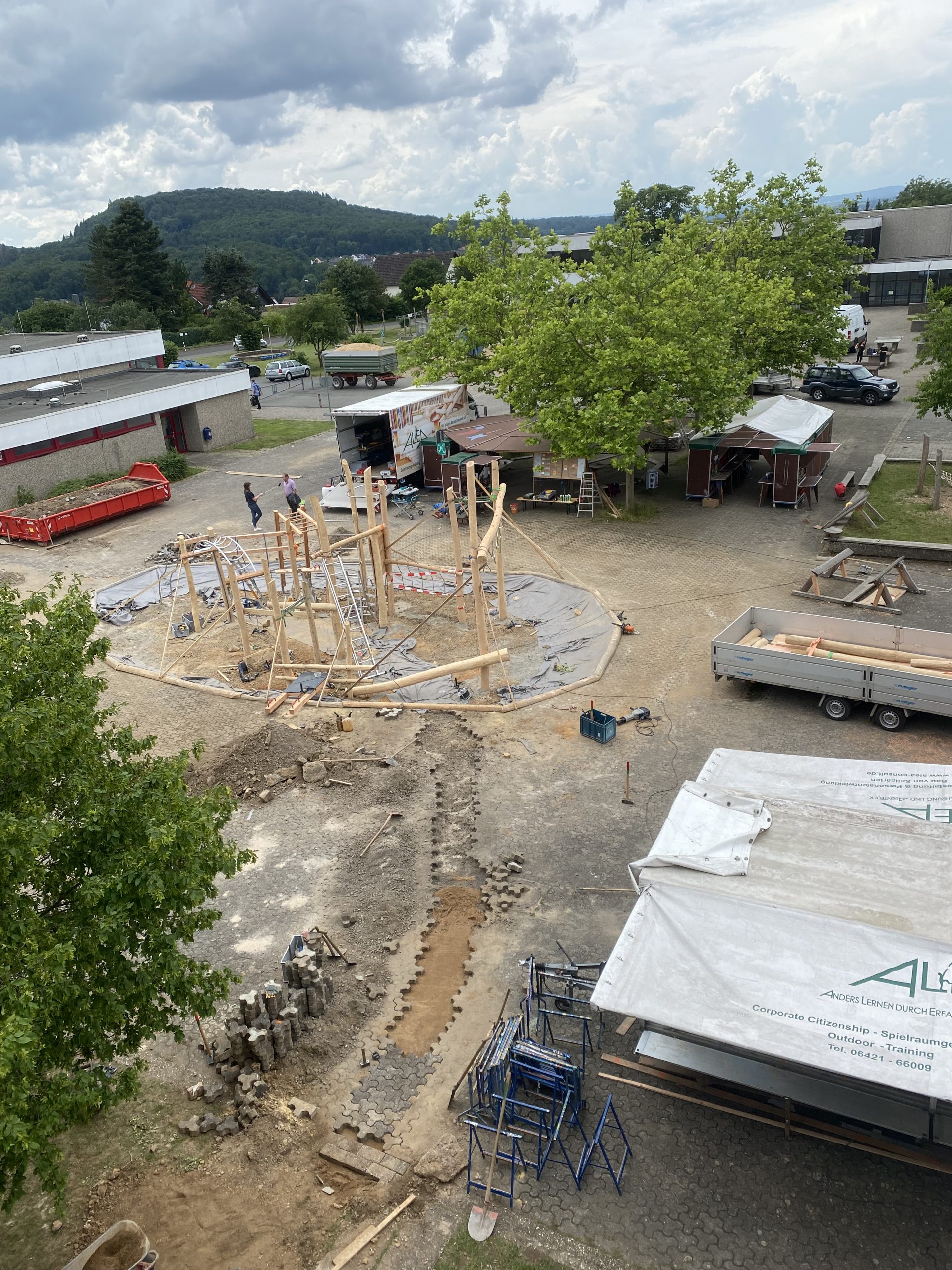 Die Arbeiten begannen heute schon vor 8 Uhr, sowohl die Lehrerinnen und Lehrer als auch die ALEA-Mitarbeiter bauten schon fleißig an unserem Reckstangenwald weiter. Man sagt ja: „Der frühe Vogel fängt den Wurm.“.