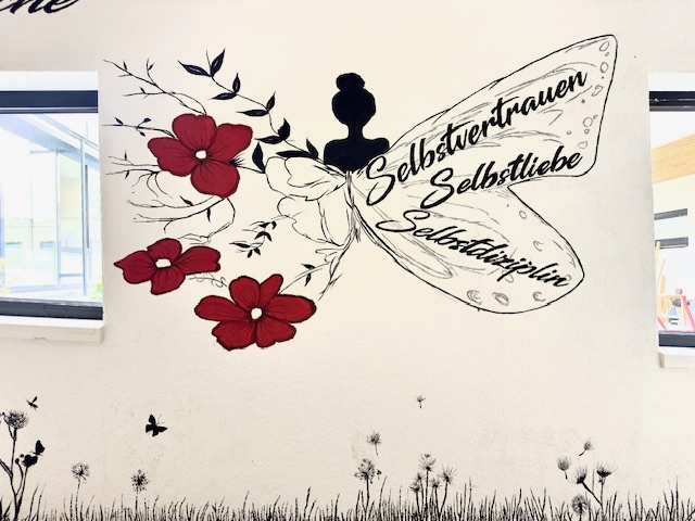 Die Wandgestaltung ist nun ein Blickfang im Schulhaus und gleichzeitig eine tägliche Erinnerung, dass Selbstliebe, Selbstdisziplin und Selbstvertrauen die Basis für persönliches Wachstum und damit auch eine gelingende Schulzeit sind.