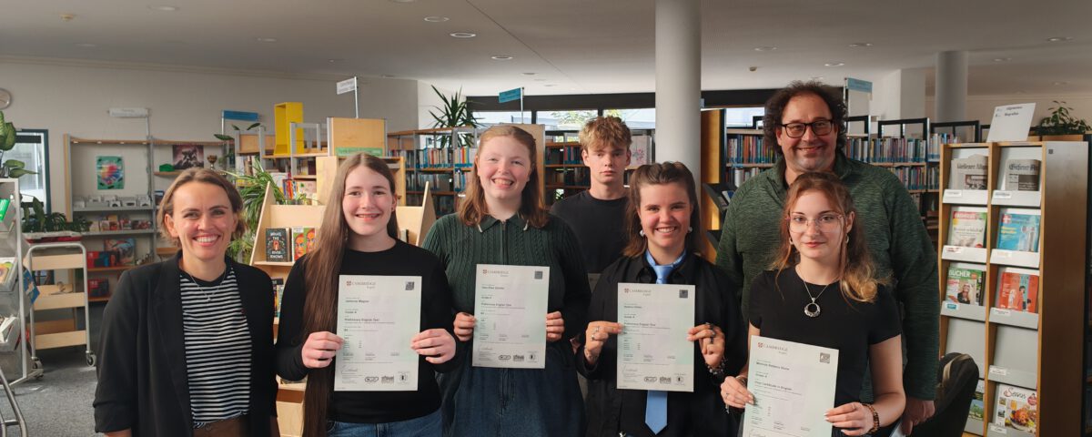 Wir gratulieren Alba Schäfer, Johanna Wagner und Nadine Hölter (Jahrgang 10) sowie Scara Amberge und Jonah Krombach (Jahrgang 11) zu ihren sehr guten Ergebnissen im Preliminary English Test (PET). Ebenso gratulieren wir Melinda Stone zu ihrem sehr guten Ergebnis im First Certificate in English for Schools (FCE for Schools).