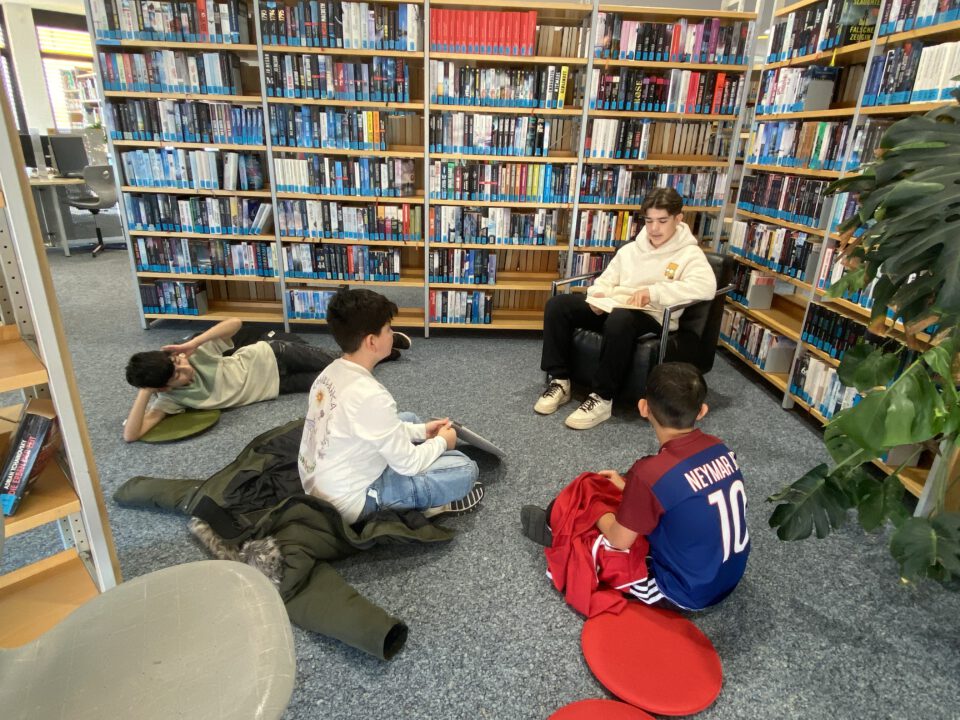 In der Mediothek der Schule bekamen 184 Fünftklässler im Laufe des Vormittags in Kleingruppen vorgelesen – und zwar von 28 engagierten Schülerinnen und Schülern aus den 10. Klassen des Gymnasial- und Realschulzweigs. Die sorgfältige Bücherauswahl traf Brigitta Oschinski aus der Mediothek, die zugleich an der Organisation beteiligt war. Initiatorin und federführend in der Planung war Simone Hajdu, die Leiterin des Gymnasialzweigs. „Gemeinsam Geschichten zu erleben verbindet – und genau das wollten wir unseren Schülerinnen und Schülern ermöglichen“, betonte Hajdu.
