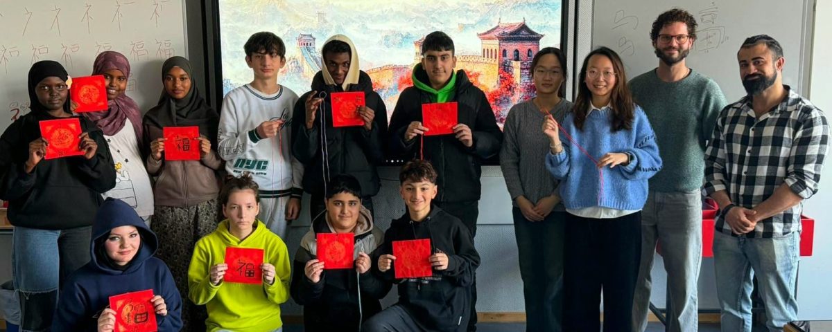 „Lernen und das Gelernte einüben – ist das nicht wahrhaft ein Vergnügen?“ – so beginnen die Gespräche des Konfuzius – Meister Kong – und ganz in diesem Sinne begaben sich auch einige Schülerinnen und Schüler der Klasse DaZ2 gemeinsam mit ihren Lehrkräften Lisa Feldmann, Jonas Voll und Ahmet Yilmaz auf eine Lernreise in die chinesische Kultur. Ermöglicht wurde das Eintauchen in Sprache, Kultur und Geschichte des Reichs der Mitte durch das große Engagement der beiden Studentinnen Wu Ke und Guo Yanxin, die im Rahmen des Projekts Europa macht Schule bereits im Dezember den Weg an die Clemens-Brentano-Europaschule auf sich genommen und ein erstes Projekt zur Bedeutung der Chinesischen Mauer begonnen haben. Es handelte sich dabei jedoch nicht um einen simplen Vortrag der Geschichte des Monuments, sondern um die Bedeutung von Mauern und Grenzen im Allgemeinen – und nicht zuletzt um das Aufbrechen der steinernen Wälle, um ein Miteinander zu ermöglichen. Besondere Begeisterung löste eine erste Einführung in die chinesische Schrift aus, die beim nächsten Treffen noch praktische Anwendung finden sollte.