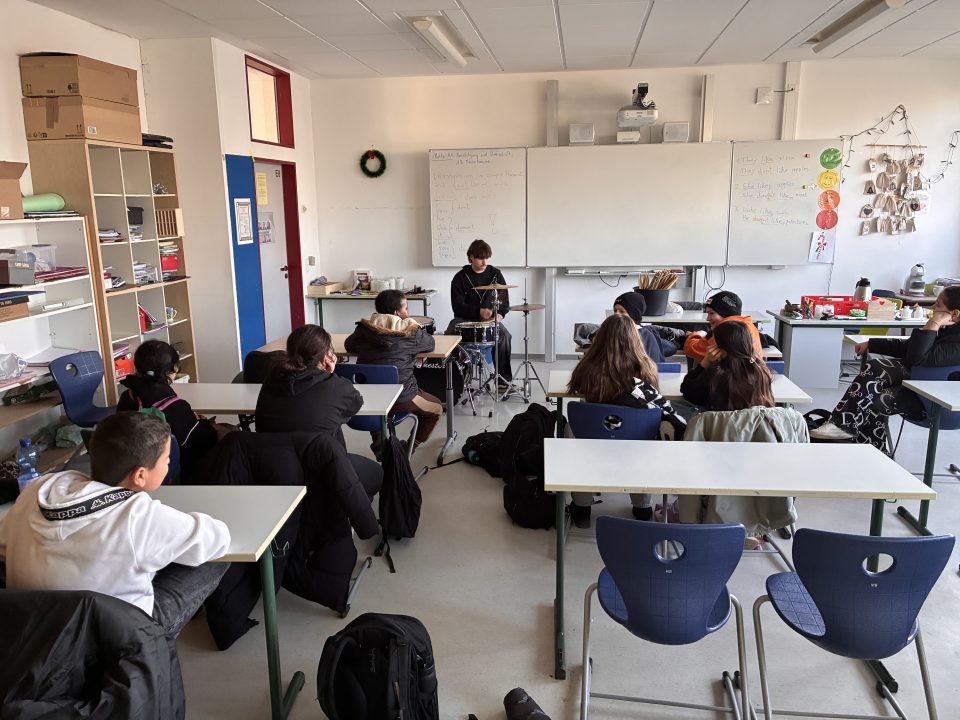 Für Begeisterung sorgte auch der Workshop von Joshua Juncker, dem Leiter der Schlagzeug-AG. Mit seinem Können und ordentlich Lautstärke beeindruckte er die Kinder – und natürlich durfte das eigene Ausprobieren nicht fehlen.