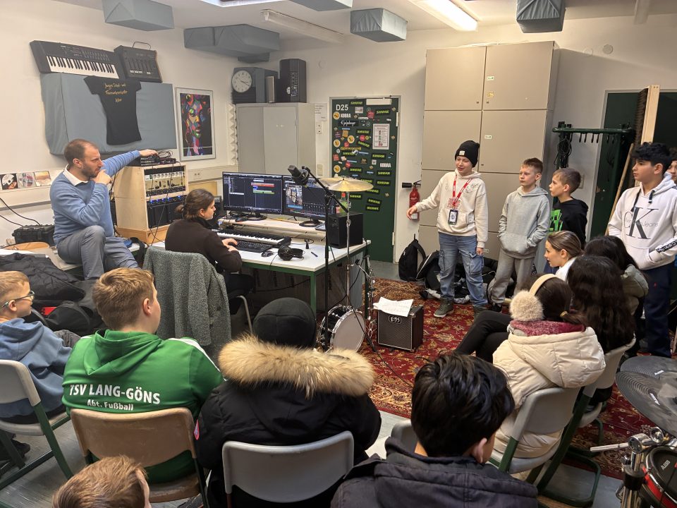 Auch das Produzieren eigener Musik war Teil des Tages: Alex Hock und Sophie Holstein, die gemeinsam die Tonstudio-AG leiten, erarbeiteten mit den Klassen einen eigenen Song. Jede Klasse übernahm dabei einen eigenen Part – vom Grundbeat bis zum Einsingen des Textes. Das fertige Ergebnis kann man sich sogar anhören.