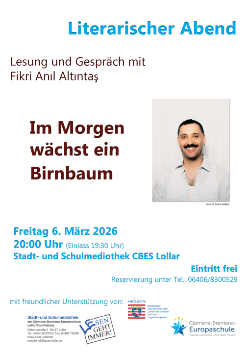 Am 6. März 2026 lädt die Stadt- und Schulmediothek der CBES Lollar zu einem besonderen literarischen Abend ein. Autor Fikri Anil Altintaş liest aus seinem Werk „Im Morgen wächst ein Birnbaum“ und spricht im Anschluss über Themen, die seine Texte prägen. Die Veranstaltung beginnt um 20:00 Uhr (Einlass ab 19:30 Uhr) und der Eintritt ist kostenfrei. Eine Reservierung ist telefonisch möglich.