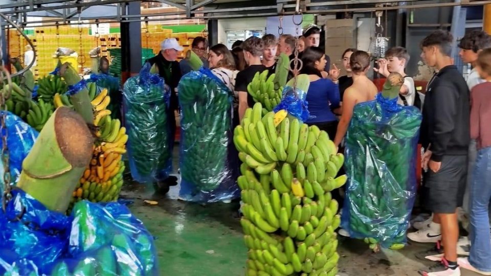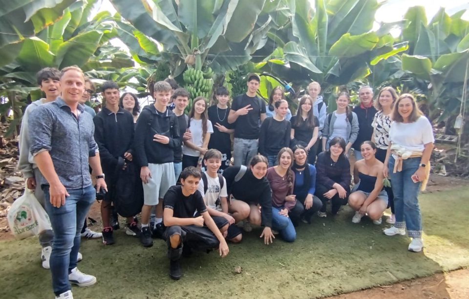 So besuchte die Gruppe eine Bananenplantage in Agaete, die zu den größten der Insel zählt und eine Fläche von rund 600 Hektar umfasst. Dort konnten die Schülerinnen und Schüler alles rund um die Bananenpflanze lernen: Wie werden die Pflanzen angebaut? Welche klimatischen und ökologischen Bedingungen sind für den Anbau essenziell? Wie werden sie geschützt? Wie verläuft die Bananenernte ab? Diese Fragen konnten im Schatten riesiger Bananenstauden vor Ort von Bio-Bauern beantwortet und veranschaulicht werden. Im Anschluss wurde eine Verpackungsfabrik besichtigt, in der die Bananen für den Export ins Ausland sowie für die Versorgung der kanarischen Inseln vorbereitet werden. Die Schülerinnen und Schüler erhielten Einblicke in die Produktionskette von der Ernte bis zum Versand und lernten, welche Rolle Nachhaltigkeit in der Landwirtschaft und Logistik spielt.