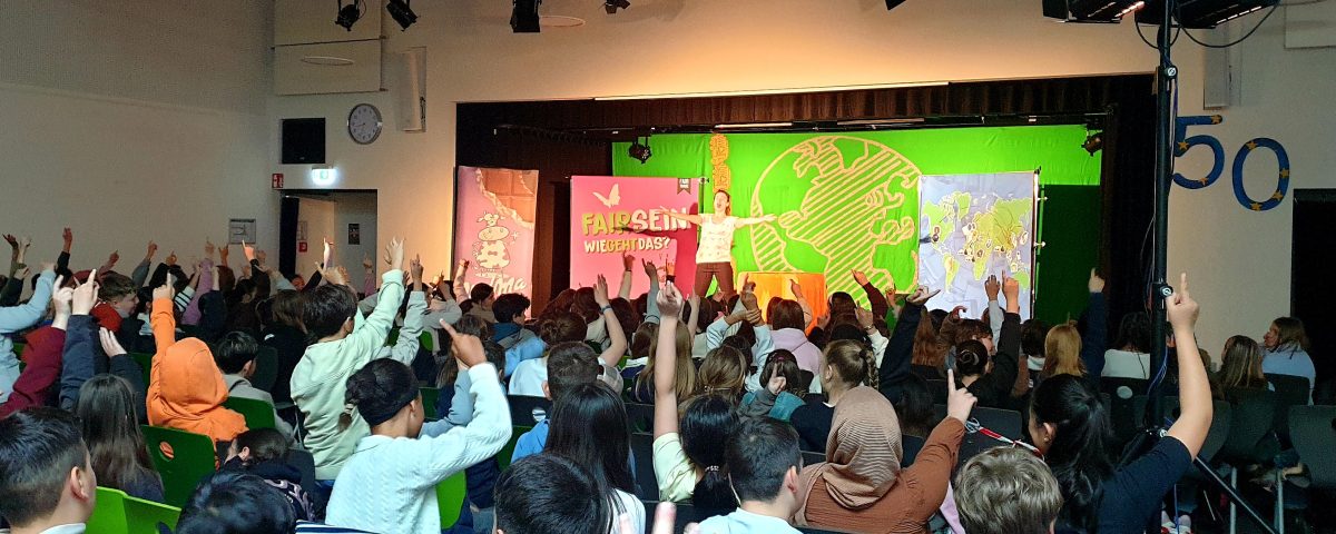 Eine turbulente Solo-Show rund ums Thema Globale Gerechtigkeit – mit Theaterszenen, Songs, kreativen Mini-Vorträgen und interaktiven Publikumsspielen. Anschnallen, gut am Stuhl festhalten, und los ging es auf eine kunterbunte weltweite Reise: Zur Müllkippe in Agbogbloshi (Ghana), wo die kaputten Computer und Spielekonsolen aus deutschen Kinderzimmern landen… in einen Sweatshop in Dhaka (Bangladesh), wo der zwölfjährige Ridoy ein T-Shirt näht… auf die Kakaoplantage in Buake (Elfenbeinküste), wo Kindersklaven die Snickersriegel pflücken… und zurück in die Welt der Schülerinnen und Schüler, wo alle etwas an diesen Zuständen ändern können!