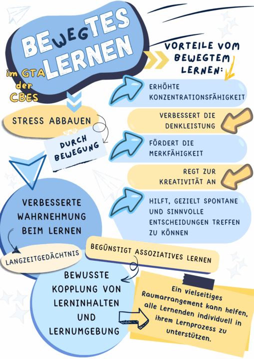 Der Unterricht im Bereich des Ganztagsangebots an der CBES ist gekennzeichnet durch ein hohes Maß an individualisierter Lernzeit sowie vielfältigem Projektunterricht. Diese Angebote stehen im Einklang mit wichtigen Elementen des „Bewegten Lernens“, weshalb den Schülerinnen und Schülern im Bereich des Lernens einige Möglichkeiten offenstehen: